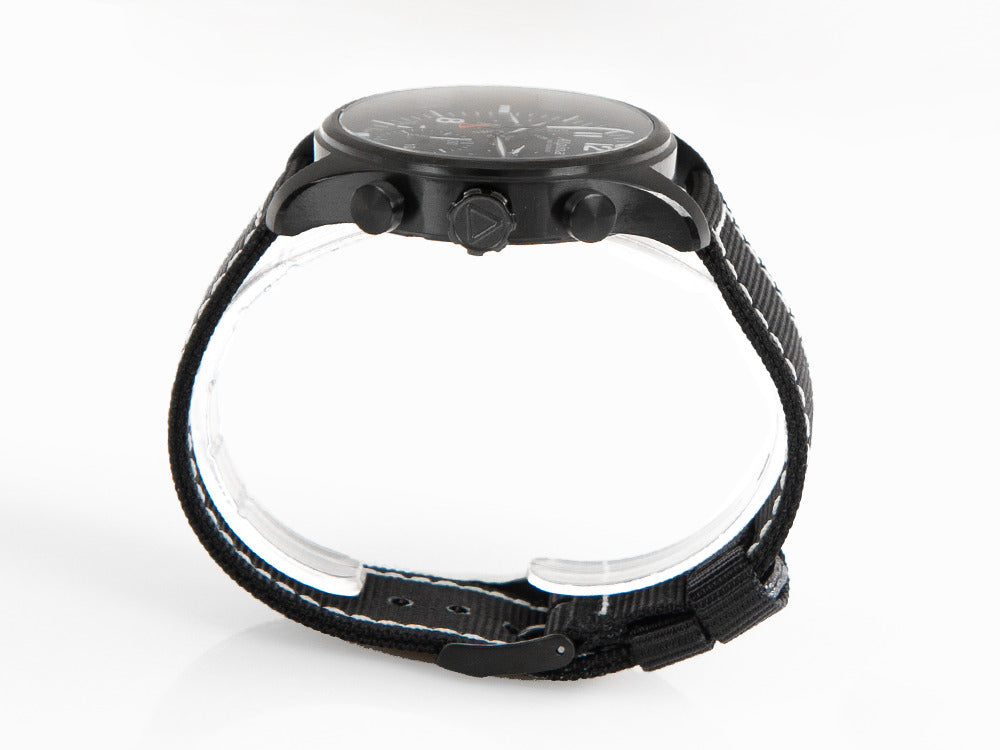 • This piece of the Startimer Pilot Chronograph collection includes the traditional Alpine Startimer dial, which provides great readability, highly prized among pilots from all over the world. This model has a design in a very elegant black color thanks to its black PVD case and its black nylon strap. It also stands out for including the chronograph and date complication, showing the day of the week. Enjoy now this piece with such a special legacy.