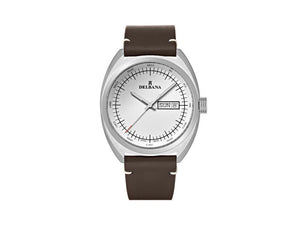 • Delbana Locarno. Classic men’s dress watch with day-date. Stainless steel case with brown genuine leather strap. White sunray-brushed dial with. Water resistant to 5 ATM / 50 meters / 165 feet.