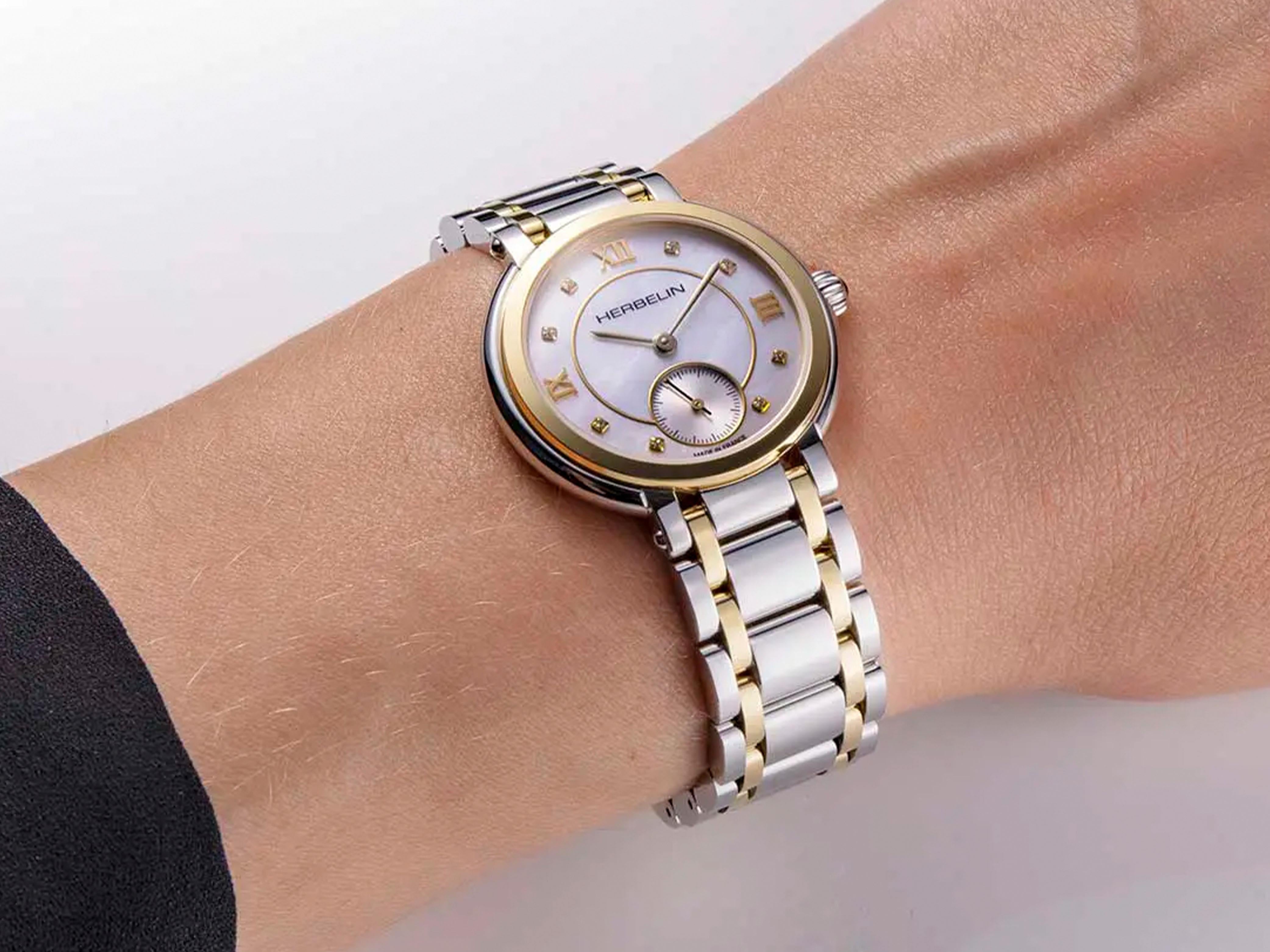• The Herbelin Galet is the perfect blend of sophistication and timeless design. Inspired by the smoothness of pebbles, its 31.5mm stainless steel case and white mother-of-pearl dial with zirconia markers exude a refined, feminine style. The blued hands and cabochon-set crown add a vintage touch, while the sapphire crystal ensures durability and clarity. Powered by a Swiss quartz movement and water-resistant up to 5 ATM, this luxury women’s watch is perfect for any occasion.